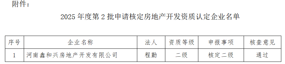 根據(jù)《房地產(chǎn)開發(fā)企業(yè)資質(zhì)管理規(guī)定》、《河南省城市房地產(chǎn)開發(fā)經(jīng)營管理?xiàng)l例》等法律法規(guī),高新區(qū)城鄉(xiāng)建設(shè)服務(wù)中心對2025年度第2批1家申請核定房地產(chǎn)開發(fā)資質(zhì)的企業(yè)進(jìn)行了審查,現(xiàn)將河南鑫和興房地產(chǎn)開發(fā)有限公司資質(zhì)認(rèn)定信息予以公布。