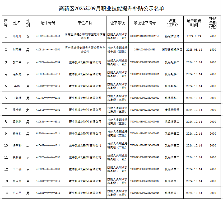 根據《河南省人力資源和社會保障廳 河南省財政廳 河南省教育廳 國家稅務總局河南省稅務局關于我省貫徹落實失業保險援企穩崗惠民政策的通知》(豫人社辦〔2025〕35號)等文件規定,現將鄒丹丹等43名符合享受職業技能提升補貼申領條件的人員名單予以公示,請予監督。